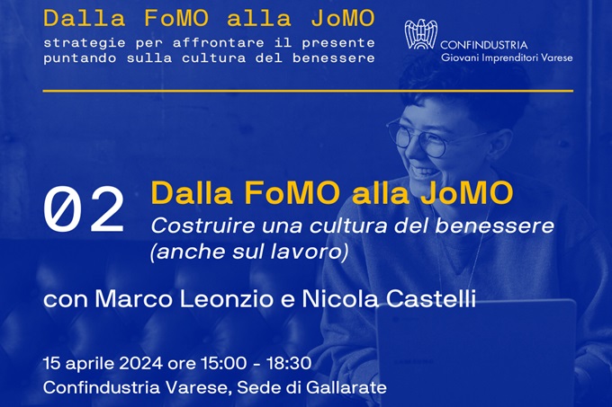 Prosegue il percorso formativo “Dalla FoMO alla JoMO, strategie per affrontare il presente puntando sulla cultura del benessere” organizzato dal nostro Gruppo, in collaborazione con Servizi Confindustria Varese e Wyde sul tema della FoMO - Fear of Missing Out - forma di ansia sociale sempre più frequente determinata dalla necessità di rimanere sempre connessi.